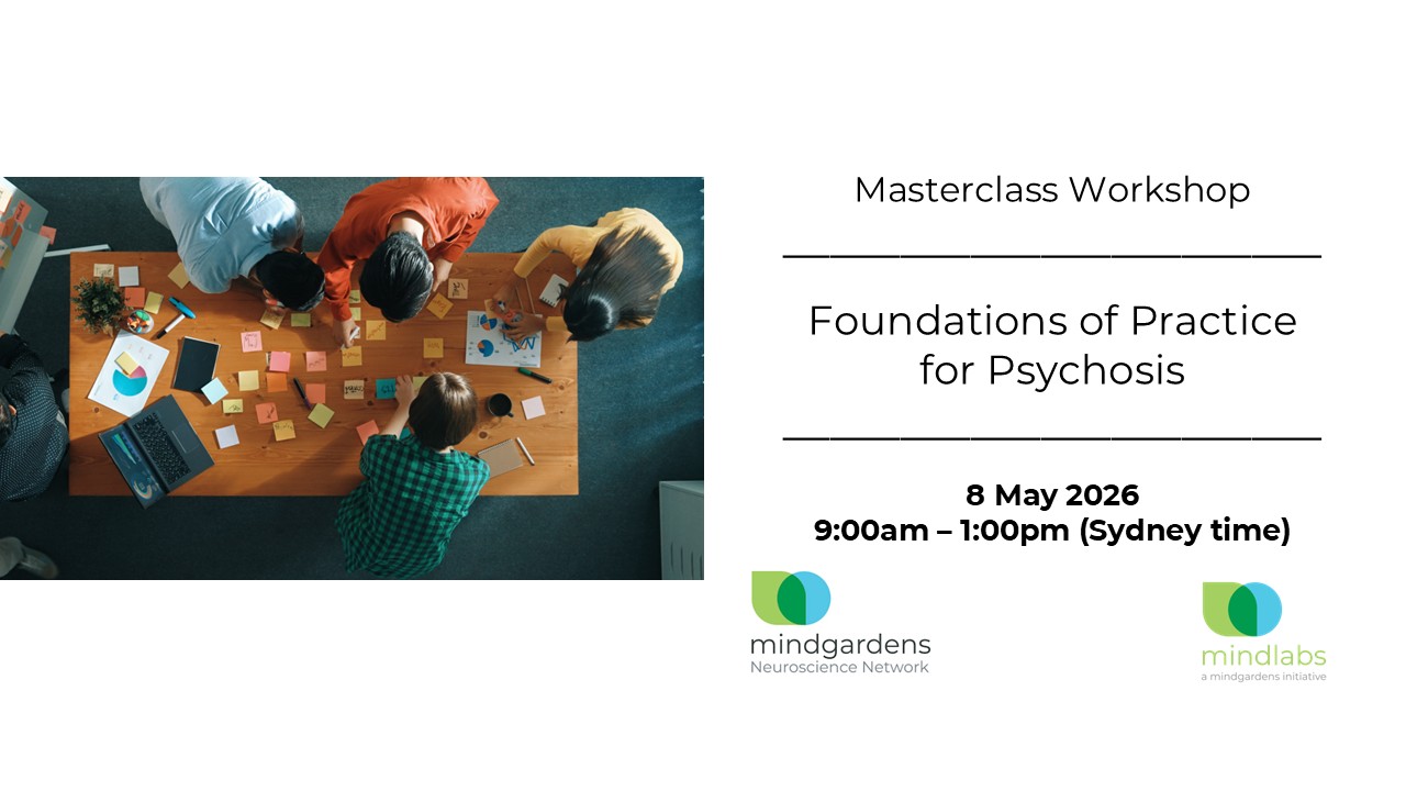 Mindgardens Neuroscience Network presents the second edition of the Mindgardens Masterclass series, Foundations of Practice for Psychosis. This series is comprised of advanced, highly-interactive sessions designed for clinicians wanting to deepen their practice through applied learning, scenario-based activities, and guided skill development.